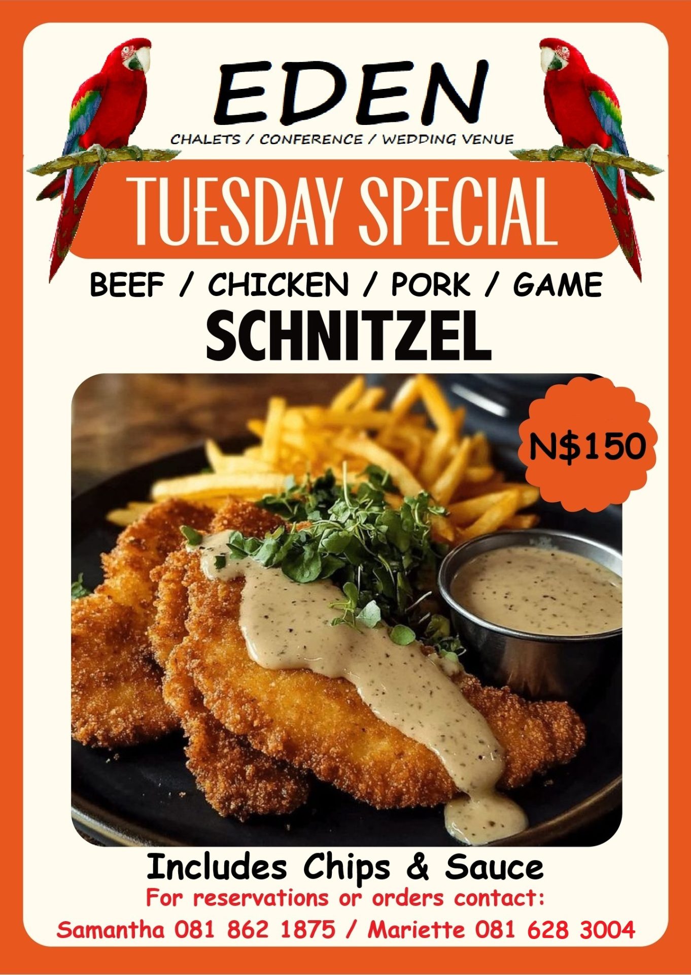 TUESDAYS – SCHNITZEL NIGHT – ANY PORK, BEEF, GAME OR CHICKEN SCHNITZEL WITH MASH & VEGGIES – 150